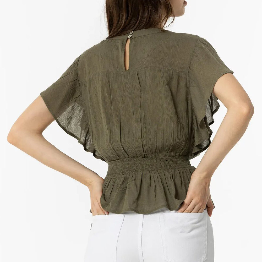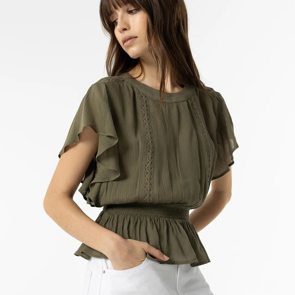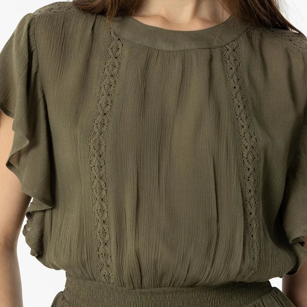 Blusa de cuello redondo y manga sisa. Aplicación de encaje, volantes y elástico en la cintura. Cierre trasero con botones.