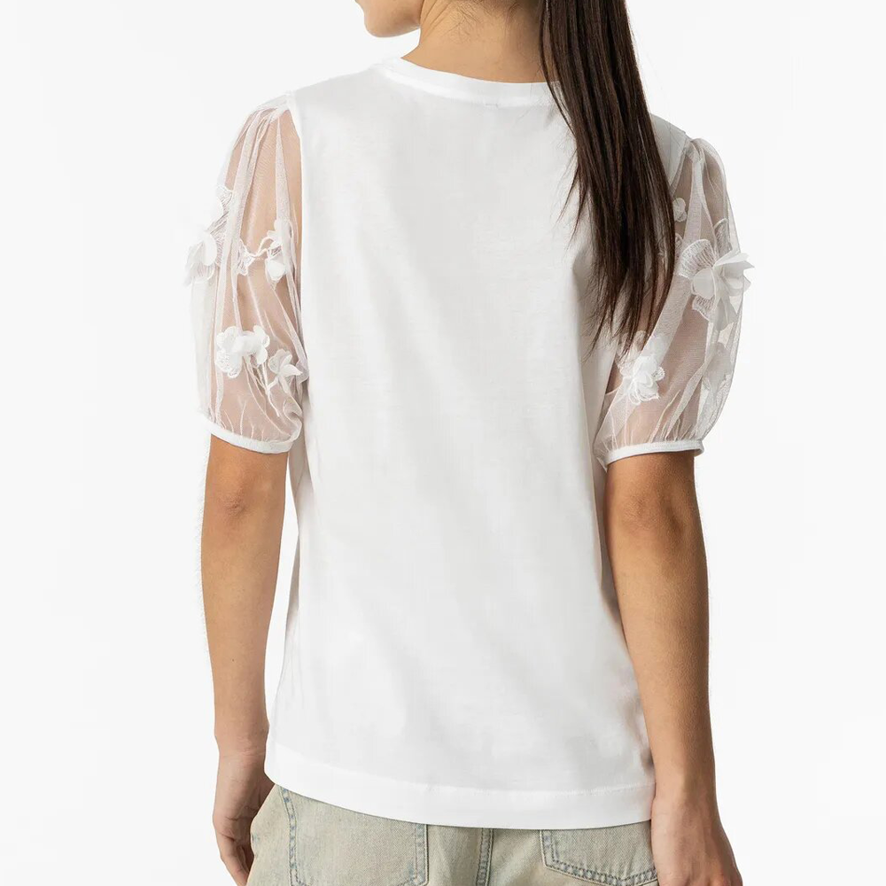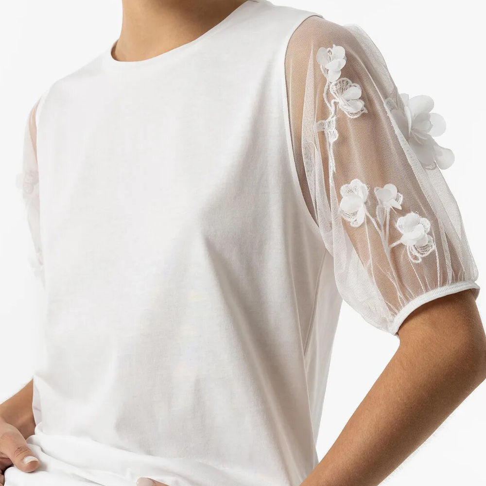 Camiseta de cuello redondo y manga corta en rejilla con aplicación de flores.