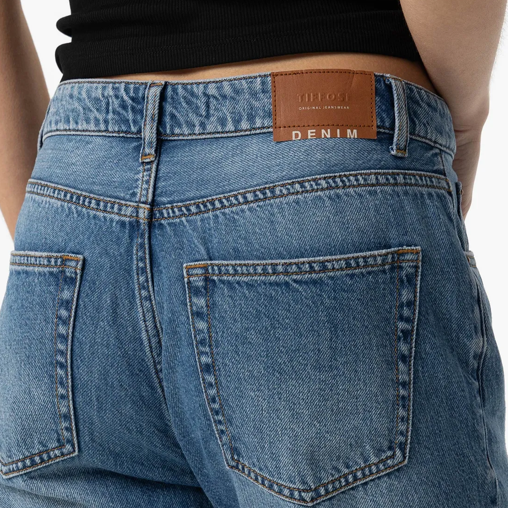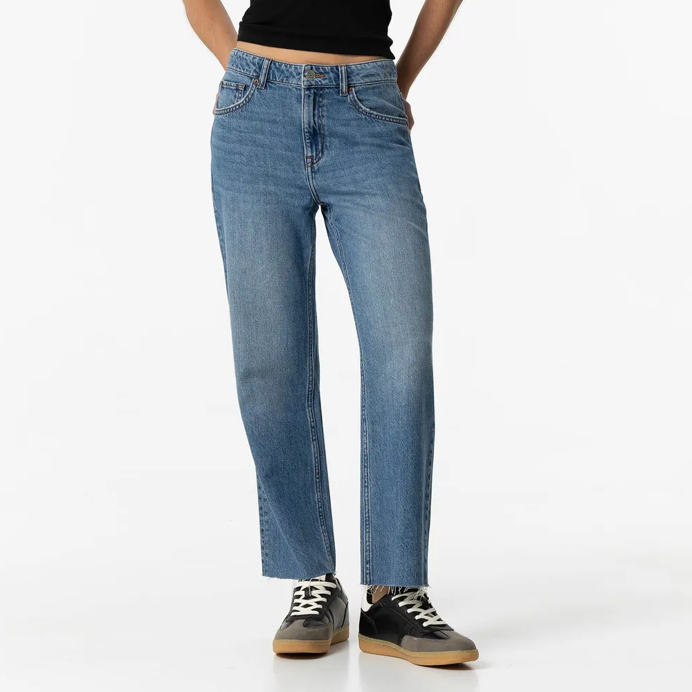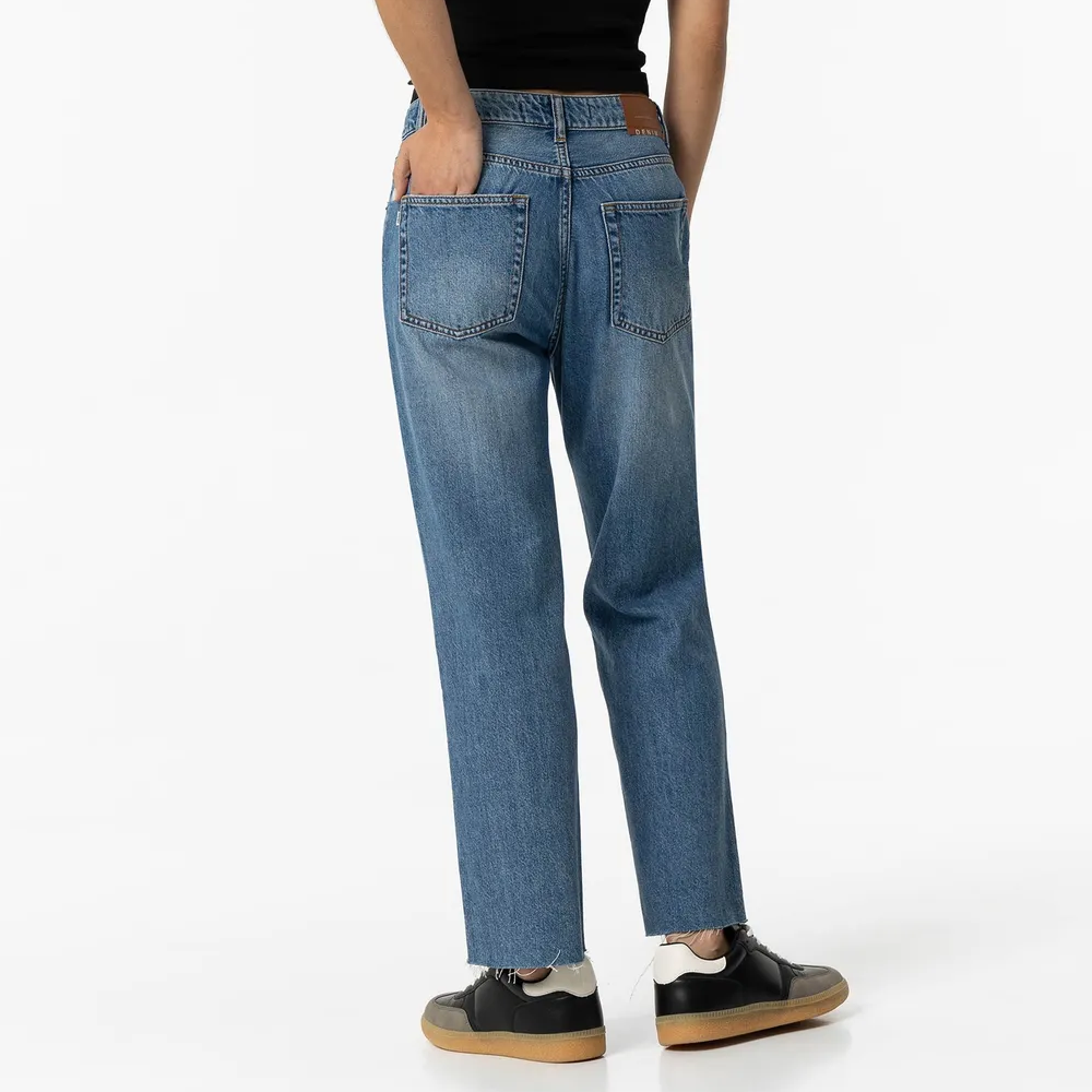 Jeans de tiro alto y pernera recta y cinco bolsillos. Cierre frontal con cremallera y botón metálico. Bajo acabado desflecado.
