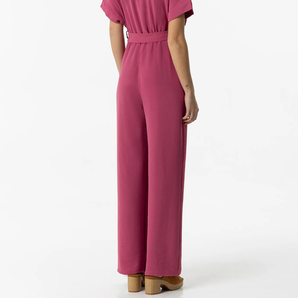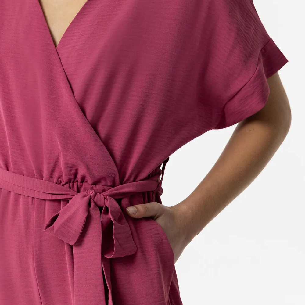 Mono con escote cruzado y manga corta. Aplicación de cinturón del mismo tejido. Elástico en la cintura. Bolsillos laterales.